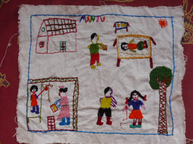 Nu har vissa av dem broderat bilder under kortare perioder i 5 år. Bilderna har utvecklats hos många, några var påhittiga och skickliga redan när de startade. Någon verkar inte tycka det är kul alls. De syr med sybåge mycket koncentrerat och kollar på varandra. De syr ofta på varandras. Genom bilderna får jag fler och fler små pusselbitar om deras verklighet. Jag fick veta att det finns en vaccinationscentral som uppstår en dag i månaden eller var det veckan. Jag fick veta att att man besöker en helig man som ger en en amulett när läkaren inte förmår längre. Jag fick veta att byn inte har sophämtning och att parken på andra sidan gatan är privat. Fast alla pojkar hade ju varait där i massor och först när flickorna ville flyga drake där blev det ett himla halllå. Jag berättade för flickorna att de för tre år sedan inte ville gå i skolan när jag frågade, inte såg någon större vits med det. Nu verkar alla vilja gå. Tyvärr har många slutat för så många år sedan att det är mkt svårt att hoppa på igen. Vi uppmanade dem att satsa lite pengar på att få undervisning av flickan som har gått längst i skola och som vill bli lärare. Ibland ser vi skolflickor hemma och frågar varför.